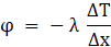 Fourier's law relates the heat flux φ through a material to its thermal conductivity λ, the temperature difference between two points ΔT, and the distance between those points Δx: